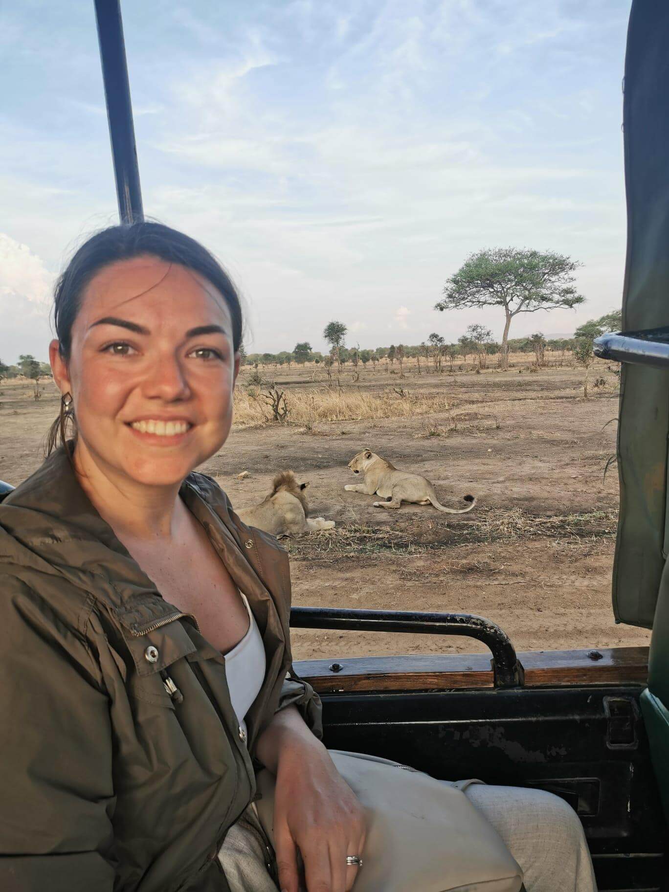 Kora reggel vadászó oroszlánokat figyelni Tanzániában a férjemmel.