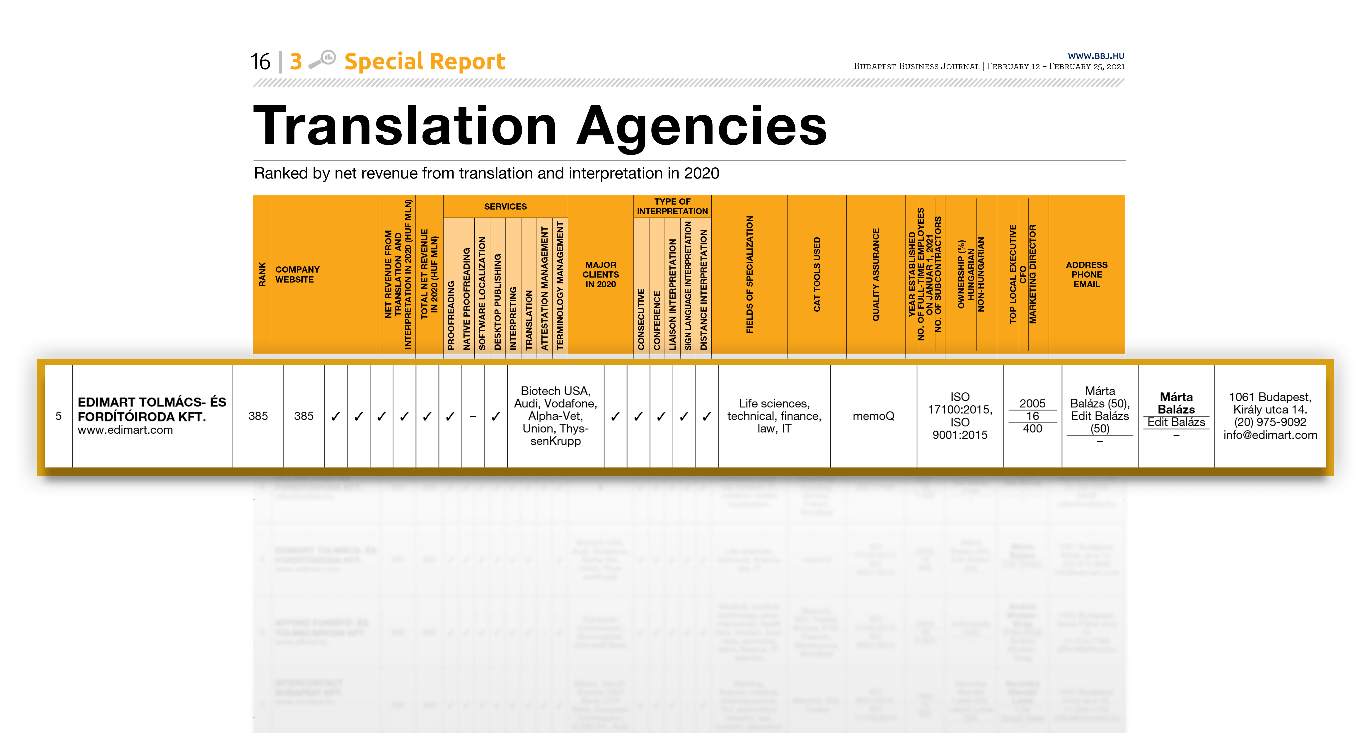 A Budapest Business Journal iparági felmérése szerint a 2020-as év árbevételi adatai szerint az EDIMART Magyarország 5 legnagyobb fordítóirodája közé tartozik!